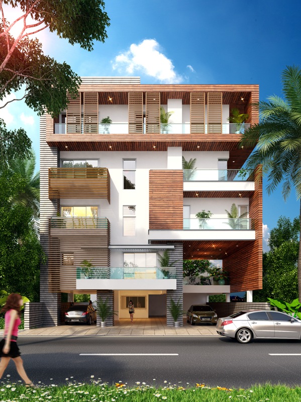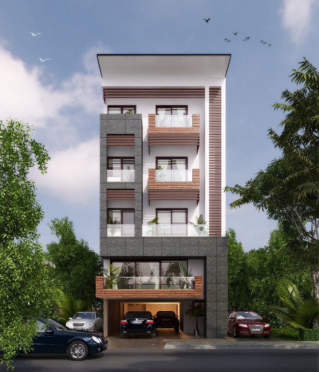 Squeezed between multi-storied residential house, this infill 300sq yd apartment block is placed on local street alignment with elevated open terraces.